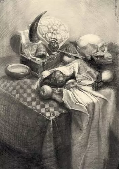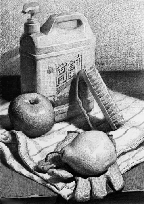 有的初學(xué)者面對(duì)靜物寫生經(jīng)常說不會(huì)畫,似乎表現(xiàn)技法獨(dú)立于實(shí)物之外,這是一種極端的誤區(qū)。古人說:“師法自然 ”,自然即老師。作為寫實(shí)性素描,就是在“師法自然”。不是不會(huì)畫,而是不會(huì)看。面對(duì)一組具體存在的物體,眼睛不會(huì)觀察,看不到整體之間的區(qū)別與聯(lián)系,看不出局部的細(xì)微變化與互動(dòng),而是一味的討要方法,實(shí)在是寫生的大忌。觀察不外乎整體對(duì)比:大和小的區(qū)別、高和矮的區(qū)別、平和斜的區(qū)別、黑和白的區(qū)別、硬與軟的區(qū)別等等,找出相互的差別就是整體對(duì)比。沒有整體對(duì)比的觀察方法,局部孤立的表現(xiàn)永遠(yuǎn)是錯(cuò)誤的。