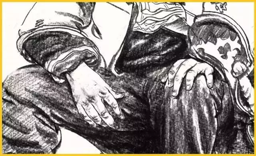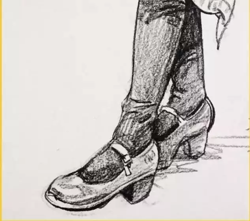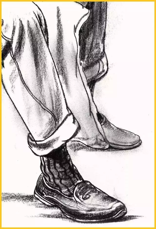 腿部:腿部無(wú)論從正面還是從側(cè)面看,輪廓都不是直的,而是高低起伏的曲線。所以腿部衣紋的表現(xiàn)要與大腿的結(jié)構(gòu)轉(zhuǎn)折和運(yùn)動(dòng)方向一致,同時(shí)注意表現(xiàn)手法的多樣性。膝關(guān)節(jié)部位是腿部產(chǎn)生衣紋的關(guān)鍵點(diǎn),通常支起的膝蓋部位形成了凸出的點(diǎn),衣紋以此為核心,向大、小腿方向以長(zhǎng)短、寬窄不同的褶紋呈放射狀擴(kuò)散。畫(huà)腳要注意其外形及與腿的上下貫通,腿與腳不必分開(kāi)畫(huà)。