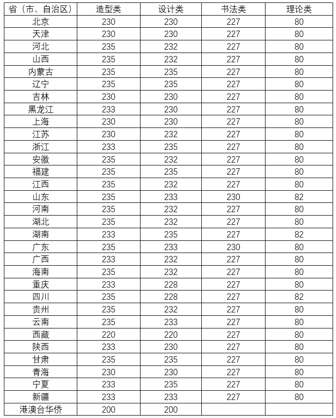 (一)造型類、設計類、書法類、理論類的合格分數線